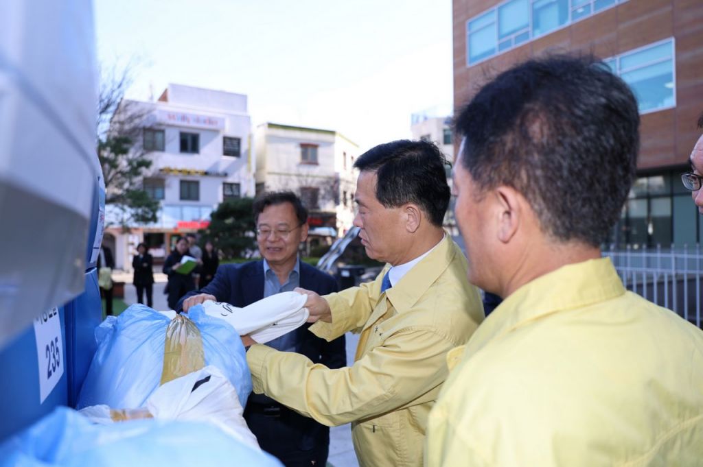 이승로 성북구청장(오른쪽)이 영남 산불 피해지역에 보낼 이재민 구호 물품을 직접 확인하고 있다. 성북구 제공.