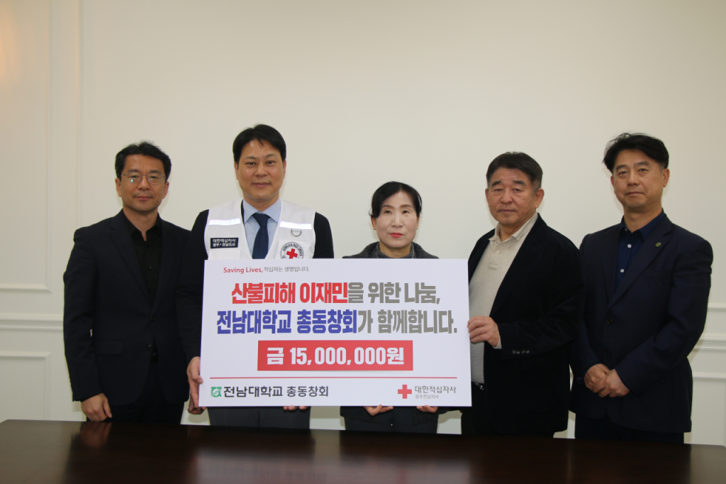 전남대학교총동창회(회장 류혜경)는 대한적십자 광주전남지사(지사회장 박재홍)에 산불 피해 이재민을 돕기 위한 성금 총 1,500만원을 전달했다고 28일 밝혔다.