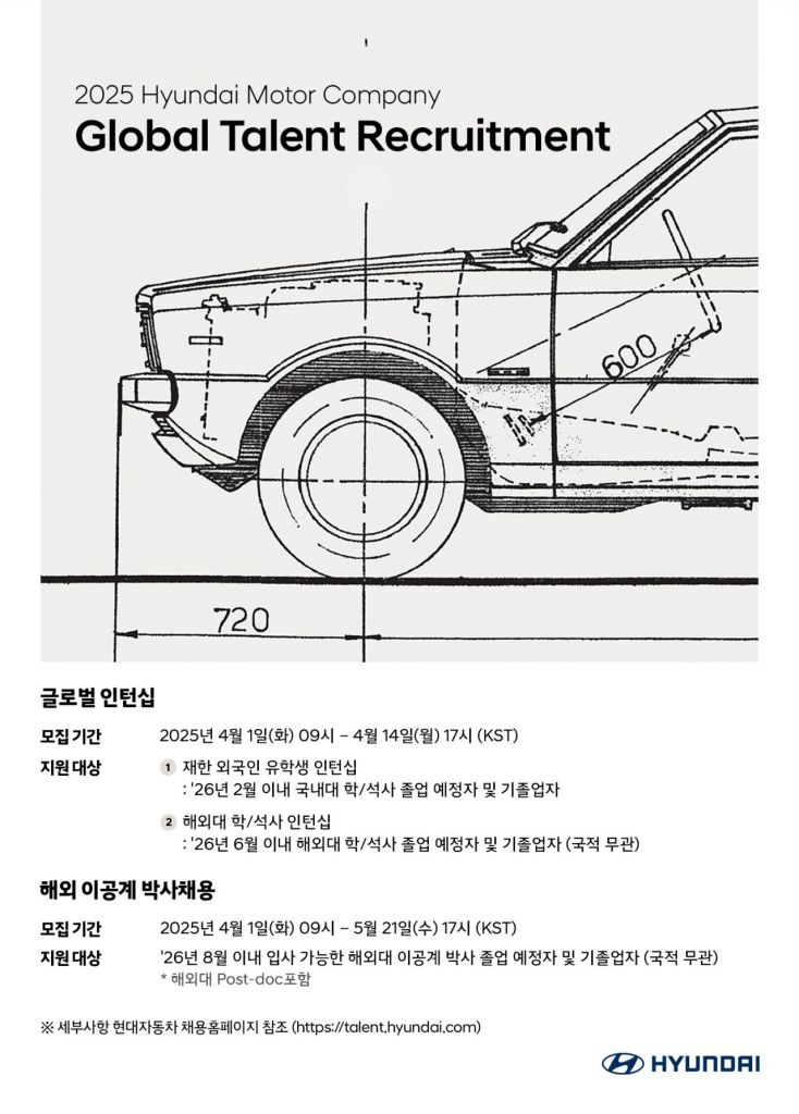 해외 이공계 박사 채용은 2026년 8월 이내 입사가 가능하고 해외에서 이공계 박사 학위를 이미 취득했거나 취득 예정인 사람이 대상이다. ▲AI·데이터 ▲배터리 ▲수소연료전지 ▲스마트 팩토리 ▲로보틱스 ▲미래항공모빌리티(AAM) ▲사이버 보안 등 7개 부문에서 진행한다.