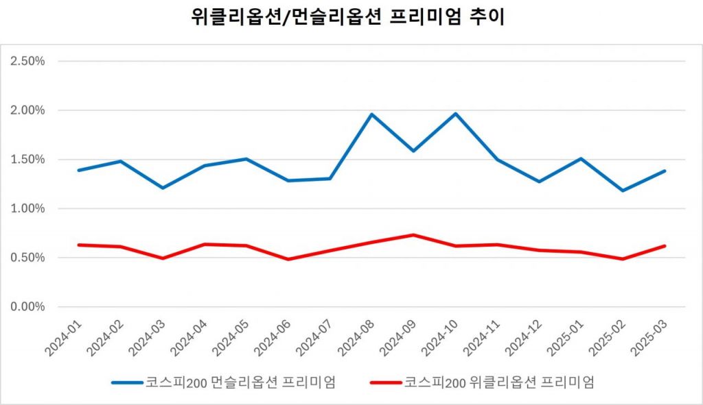 지난해 4월부터는 기존 먼슬리 옵션의 거래량을 뛰어넘어 올해 일간 평균 거래량이 125만 계약 이상으로 늘어나면서 시장 참여자들이 먼슬리 옵션에서 위클리 옵션시장으로 이동하는 모양새가 나타나고 있다. 위클리 옵션 시장 참여자가 늘어나면서 시장이 효율적으로 가격을 반영하고 있다. 위클리옵션의 프리미엄 수준은 위클리커버드콜 ETF가 상장되기 전인 지난해 초 대비 현재 유사한 수준으로 유지되고 있는 모습이다.