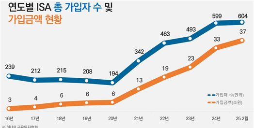 금융투자협회는 지난달 말 기준 ISA 가입자 수는 604만3000명, 가입금액은 36조5408억원으로 집계되었다고 31일 밝혔다.