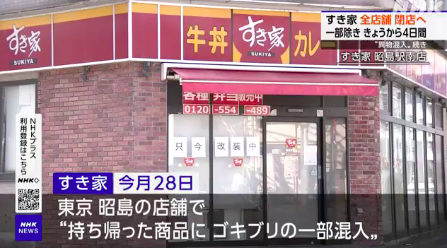 한국인들도 많이 찾는 일본 3대 규동 체인점 '스키야'가 자사 체인에서 판매한 음식에서 쥐, 바퀴벌레 등이 잇따라 발견되자 일본 내 대부분 점포를 나흘간 닫고 해충 등에 대한 대책을 추진하기로 했다.