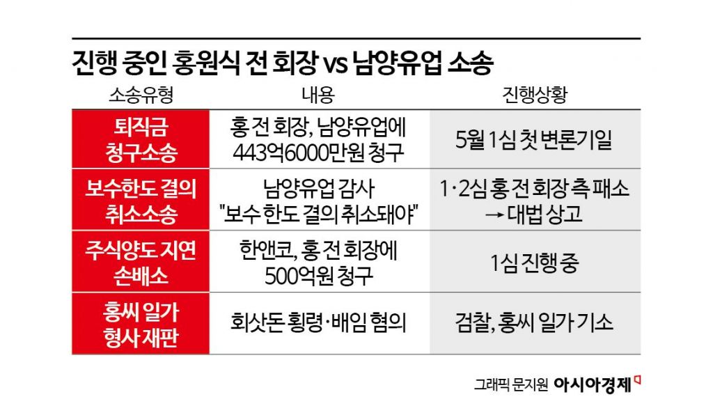 홍원식 전 남양유업 회장(74)이 회사를 상대로 낸 440억원대 퇴직금 청구소송의 첫 재판이 5월 본격화된다. 홍 전 회장이 소송을 제기하고 약 1년 만이다.