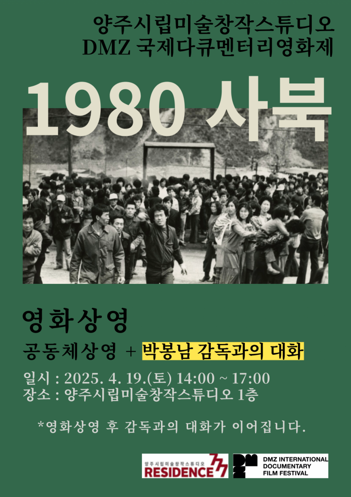 경기 양주시가 오는 4월 19일 ‘양주시립미술창작스튜디오’에서 ‘DMZ다큐멘터리영화제’가 주최하는 ‘DMZ 공동체상영 지원사업’에 선정되어 다큐멘터리 영화 ‘1980 사북’을 상영한다고 31일 밝혔다.
