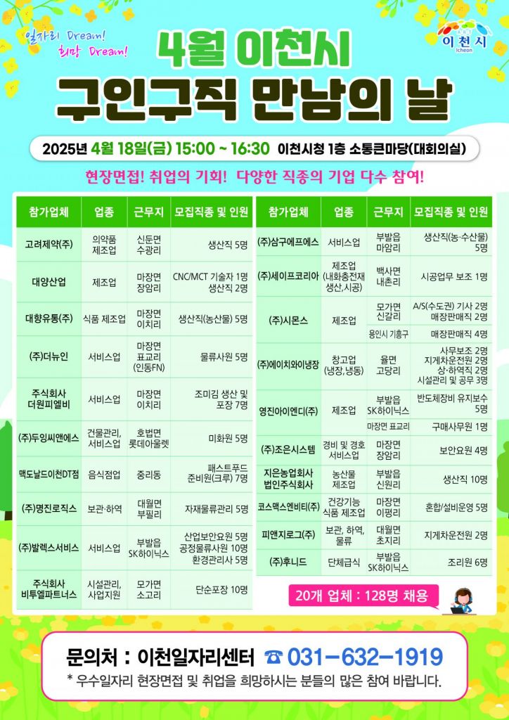 이번 행사는 취업에 어려움을 겪는 구직자와 인재 채용을 원하는 기업을 연결해 주는 채용 행사다. 행사에는 고려제약, 시몬스, 맥도날드 이천DT점 등 20개 업체가 참여해 128명의 인력을 채용할 예정이다.