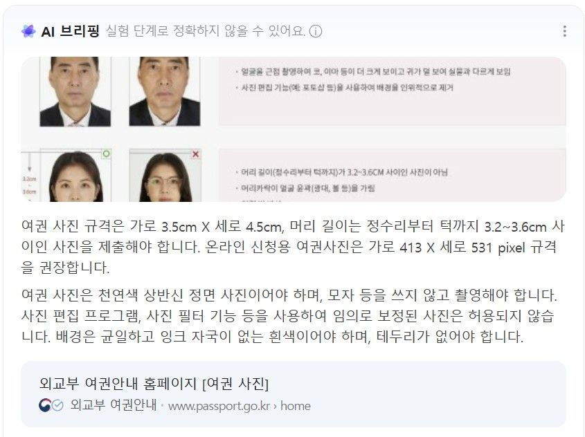 검색 결과를 보기 좋게 정리하는 건 네이버의 AI 브리핑이 앞섰다. 예를 들어 네이버에서 ‘여권사진 규격’을 검색하면 사진 규격과 촬영 시 유의사항을 AI가 글로 정리해 예시 이미지를 함께 표시한다. 구글에서 같은 검색어를 입력하면 AI가 사진 규격에 대한 정보 중심으로 정리해 항목별로 보여준다.