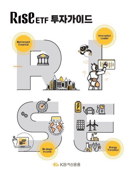 KB자산운용은 가이드북에서 고유 브랜드 투자 철학을 기반으로 한 RISE ETF의 4가지 투자 전략을 알파벳 글자 'R·I·S·E'로 하나씩 풀어 설명했다. 해외 시장의 주요 트렌드에 맞춘 ▲연금 필수자산(Retirement Essential, R) ▲혁신 선도기업(Innovation Leader, I) ▲전략적 인컴(Strategic Income, S) ▲에너지 전환(Energy Transition, E) 등이다.