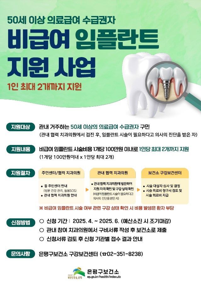 서울 은평구(구청장 김미경)는 50세 이상 의료급여 수급권자를 대상으로 최대 2개까지 비급여 임플란트 시술비를 지원한다.
