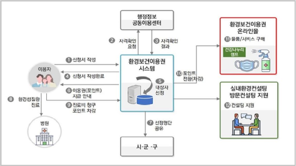 ‘환경보건이용권’은 물품 및 서비스를 구매할 수 있는 10만원 상당의 ‘상품·서비스·진료비 이용권’과 실내환경 방문 컨설팅 및 필요시 장판·벽지 교체를 지원하는 ‘실내환경 컨설팅 이용권’으로 나뉜다.