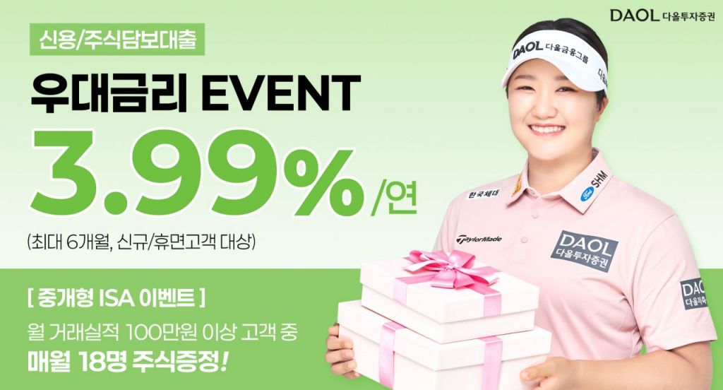 다올투자증권(대표이사 황준호)은 1일부터 신규 신용/주식담보대출 우대금리 이벤트를 진행한다고 밝혔다.