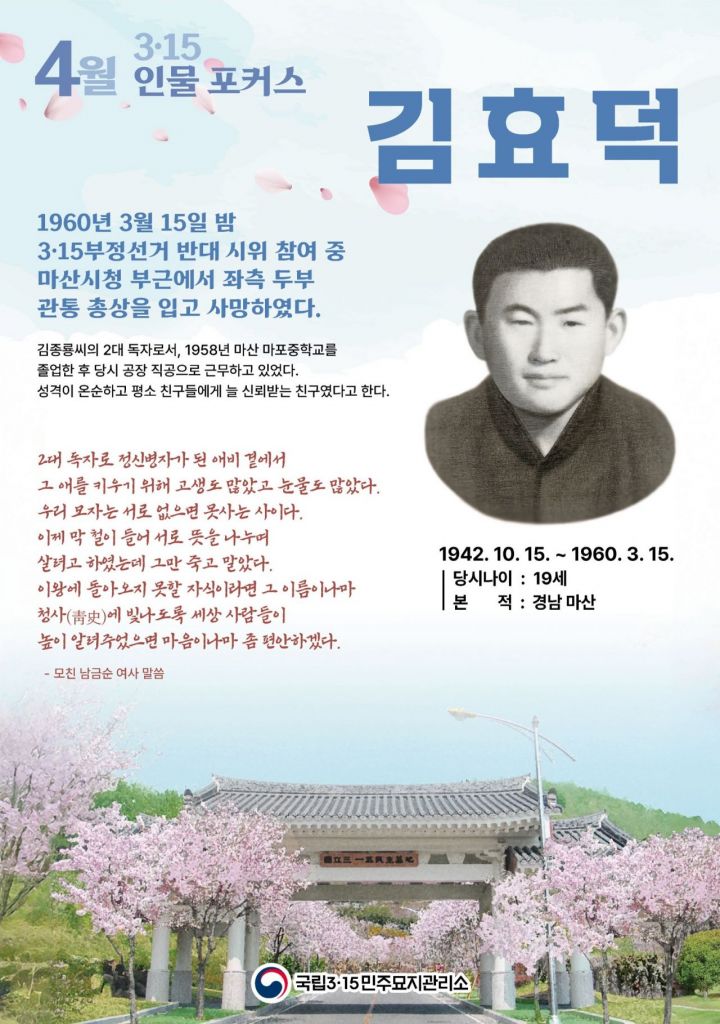 국립 3·15민주묘지관리소는 4월 3·15 인물포커스로 '김효덕 열사'를 선정했다고 1일 밝혔다.