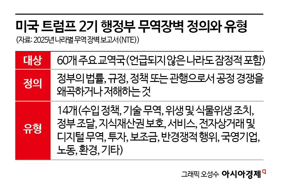앞서 USTR은 상호관세 정책 시행을 위해 지난달 미 경제단체·기관 의견 수렴을 거쳐 이번 NTE 작성 때 반영했다. 총 397페이지에 달하는 올해 보고서에서는 무역장벽의 정의가 대폭 확대됐다. 작년에는 무역장벽의 정의를 "상품 및 서비스의 국가 간 교환을 과도하게 방해하는 정부조치"로 좁게 해석했지만 올해는 "정부의 법률, 규정, 정책 또는 관행으로서 공정 경쟁을 왜곡하거나 저해하는 것으로 광범위하게 정의할 수 있다"고 했다. 여기엔 정부 주도산업 육성정책이나 정부 보조금 기반의 상품 수출 등 비시장적 정책과 관행까지 포함했다. 자국 산업을 보호하거나 특정 품목 수출을 인위적으로 장려하는 조치, 지식재산권(IP) 보호 부족 등까지 모두 무역장벽으로 꼽았다.
