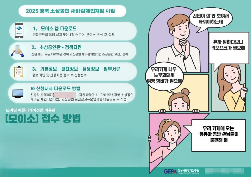 신청 기간은 4월 16일부터 5월 19일까지며 온라인(모이소 앱)과 우편(경북행복지원단)으로 신청하면 된다. 온라인·우편발송이 불가한 경우 경북경제진흥원(구미)에 5월 1일부터 5월 19일까지 방문 접수하면 된다. 이후 연 매출과 업력, 사업계획의 적정성 등 내부 평가를 거쳐 6월 말경 사업대상자를 선정한다.