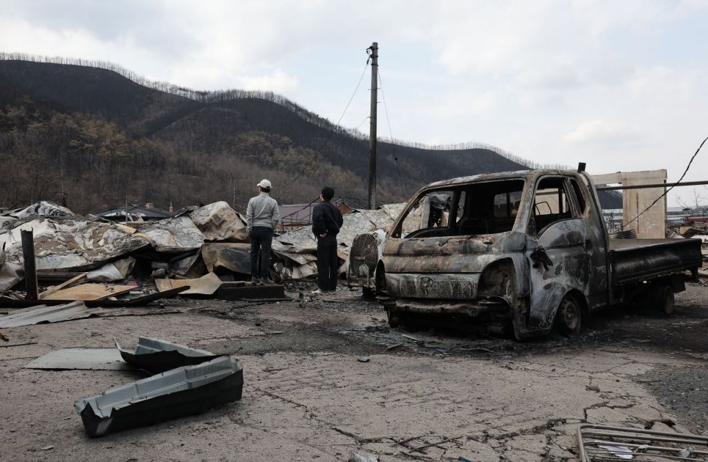 지난달 29일 경북 안동시 임하면 추목리 한 마을에 산불 이재민과 가족들이 피해 상황을 확인하고 있다. 연합뉴스