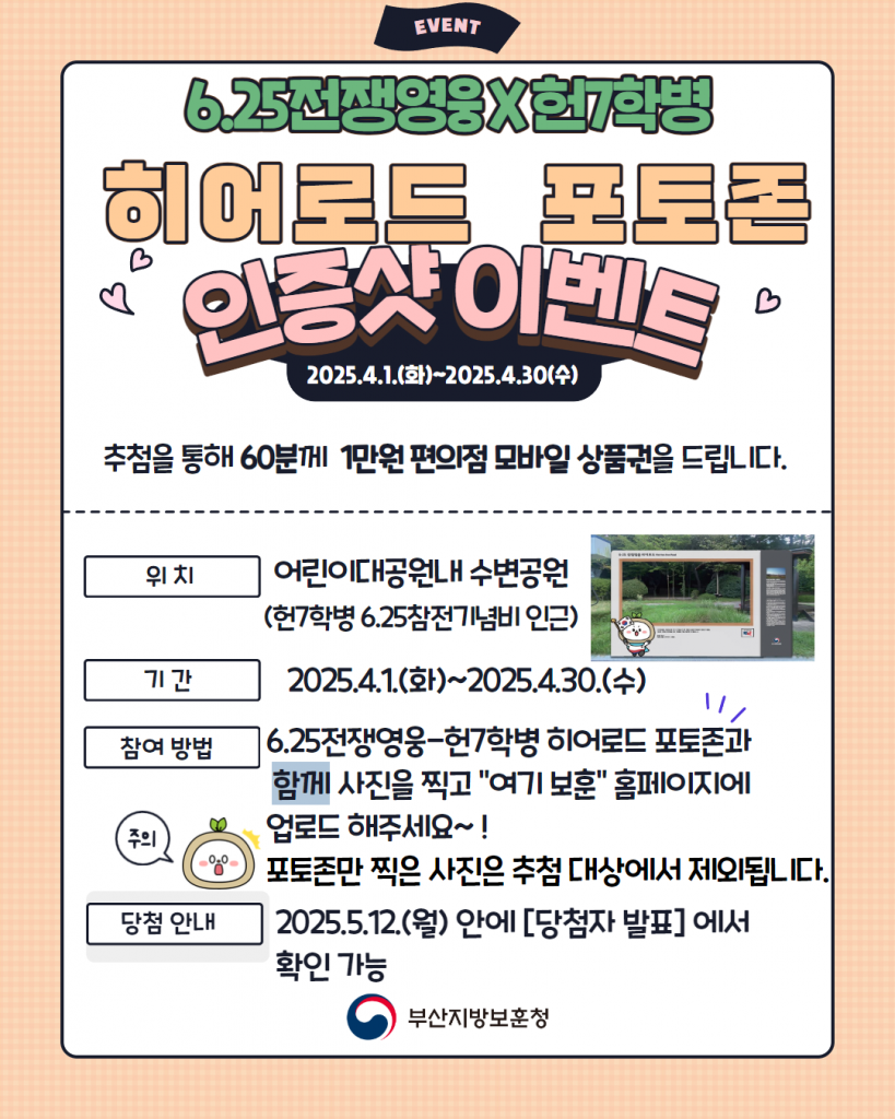 부산지방보훈청(청장 이남일)은 4월 한 달 동안 ‘6·25전쟁영웅-헌7학병 히어로드 인증샷 이벤트’를 운영한다.