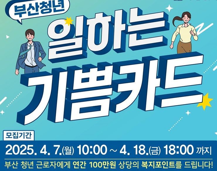 부산시(시장 박형준)는 오는 7일부터 18일까지 2025년 부산 청년 일하는 기쁨카드 지원 사업에 참여할 청년을 모집한다고 1일 알렸다.