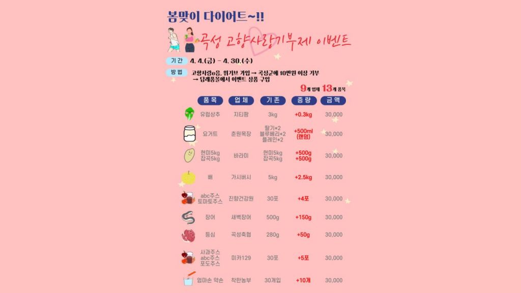 전남 곡성군(군수 조상래)은 오는 4~30일 고향사랑기부제 ‘봄맞이 다이어트’ 답례품 증량 이벤트를 진행한다고 1일 밝혔다.