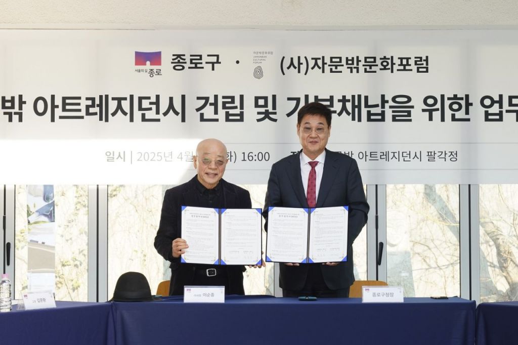 구는 자문밖 아트레지던시 조성을 위해 1일 자문밖문화포럼(이사장 이순종)과 ‘자문밖 아트레지던시 건립 및 기부채납을 위한 업무협약’을 맺었다. 이번 협약으로 종로구는 현지 조사, 인허가 등 행정적 절차의 사전 검토와 지원을, 자문밖문화포럼은 건립 계획부터 자금조달, 설계안 등을 담당하고 추후 아트레지던시를 지어 구에 무상기부하기로 약속했다.