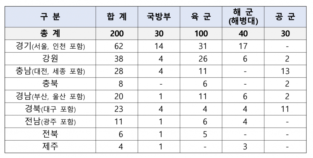 원서접수는 국방부 및 군별 인터넷 홈페이지를 통해 오는 25일 부터 진행되며, 필기시험(7월 5일), 서류전형(10월) 및 면접시험(11월)을 거쳐 최종합격자를 발표(12월)할 예정이다.
