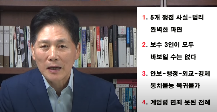 그는 헌재가 3단계 전략으로 움직였다는 평가도 했다. 그는 "첫 번째 단계는 최재해 감사원장과 검사 3인의 탄핵 기각으로 보수 진영을 달래는 것이었고, 두 번째는 한덕수 총리 대행을 복귀시켜 국정 안정화 및 조기 대선 준비를 관리하는 것이었다. 세 번째는 이재명 대표의 2심 선고였다"고 설명했다. 그러면서 "헌재가 3월 26일 이재명 대표의 2심에서 유죄 판결이 날 것이라고 예상했지만, 이 대표의 무죄 판결로 며칠이 삐끗한 거다. 무죄가 났으니까"라며 "만약에 3월 26일 유죄가 났으면 3월 28일쯤 헌재가 8 대 0 파면 선고했을 것"이라고 말했다.
