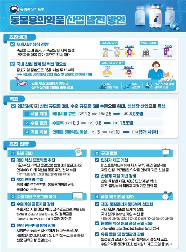 동물의약품 산업의 체계적인 육성을 위한 법체계도 마련한다. 농식품부 관계자는 "그동안 동물용의약품 산업은 규제법인 약사법 하위의 시행규칙으로만 운영돼 산업 진흥에 한계가 있었다"며 "별도의 산업 육성법을 제정해 연구개발, 전문인력 양성 등 산업 경쟁력 강화의 핵심 요소를 체계적으로 지원해 나갈 방침"이라고 말했다.