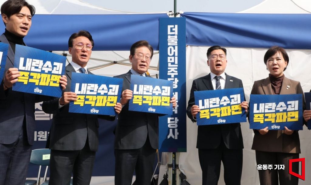 이재명 더불어민주당 대표와 박찬대 원내대표 등 최고위원들이 24일 서울 광화문에 설치된 천막당사에서 최고위원회의를 갖고 있다. 2025. 03. 24 윤동주 기자