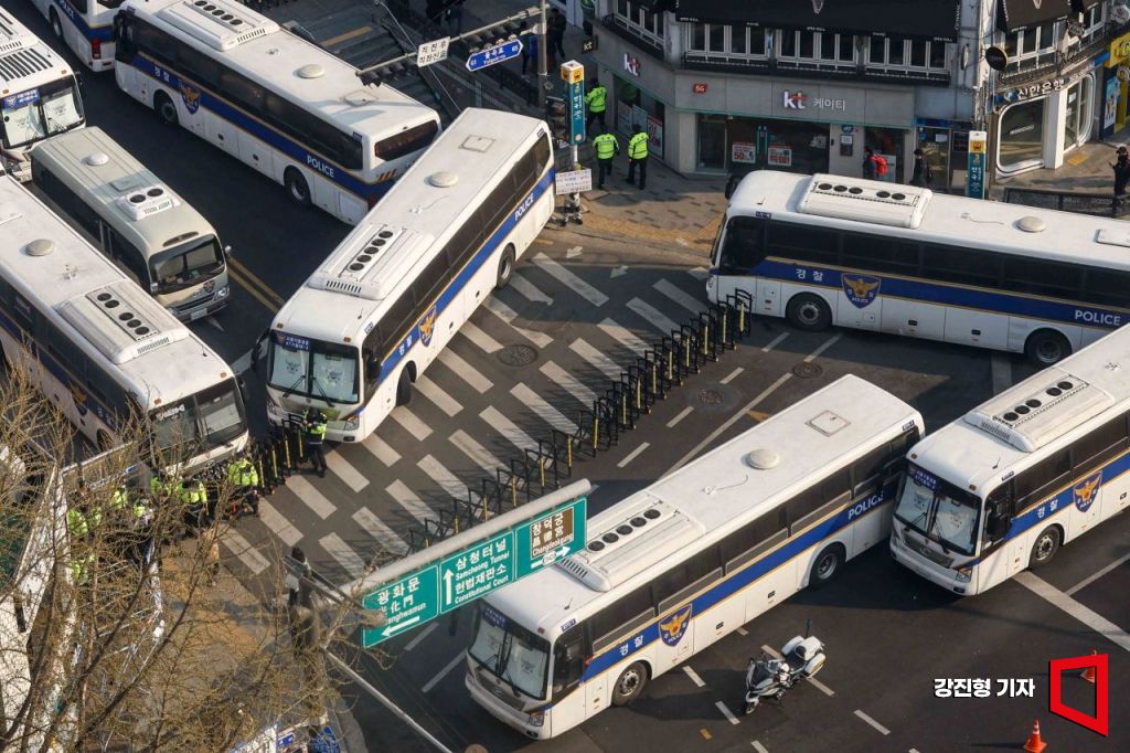 윤석열 대통령 탄핵 사건에 대한 선고가 이틀 앞으로 다가온 2일 서울 종로구 헌법재판소 주변에 경찰이 차벽을 설치하고 차량 통행을 통제하고 있다.
