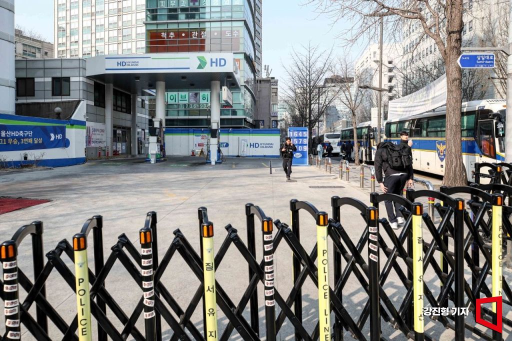 윤석열 대통령 탄핵 사건에 대한 선고가 이틀 앞으로 다가온 2일 서울 종로구 헌법재판소 인근 주유소가 안전을 이유로 임시 휴업 하고 있다.