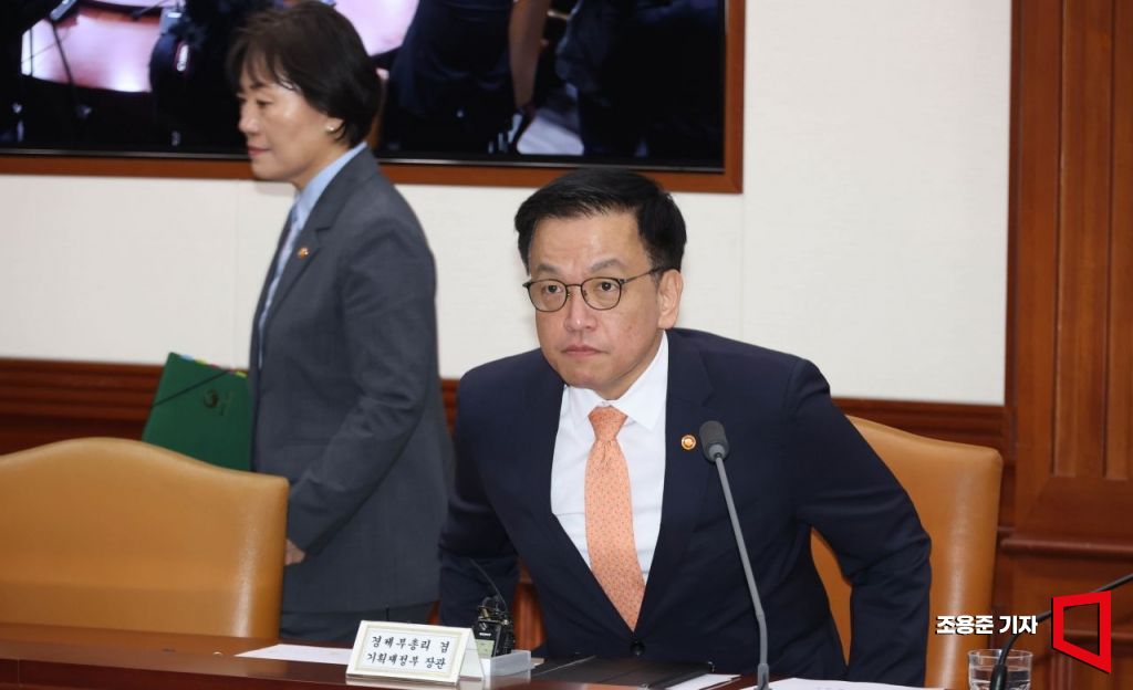최상목 경제부총리 겸 기획재정부 장관을 비롯해 경제부처 장관들이 2일 서울 종로구 정부서울청사에서 열린 경제관계장관회의에서 참석, 자리에 앉고 있다.