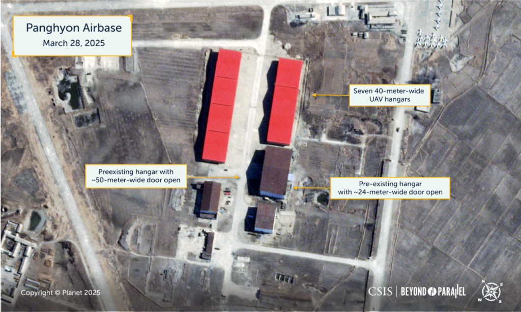 이번 보고서를 작성한 CSIS의 조지프 버뮤데즈 선임 연구원과 제니퍼 준 연구원은 위성 이미지에는 작년 7∼8월께 건설이 시작된 폭 40m의 무인기 격납고 7개가 완공된 모습이 포착됐다고 밝혔다.