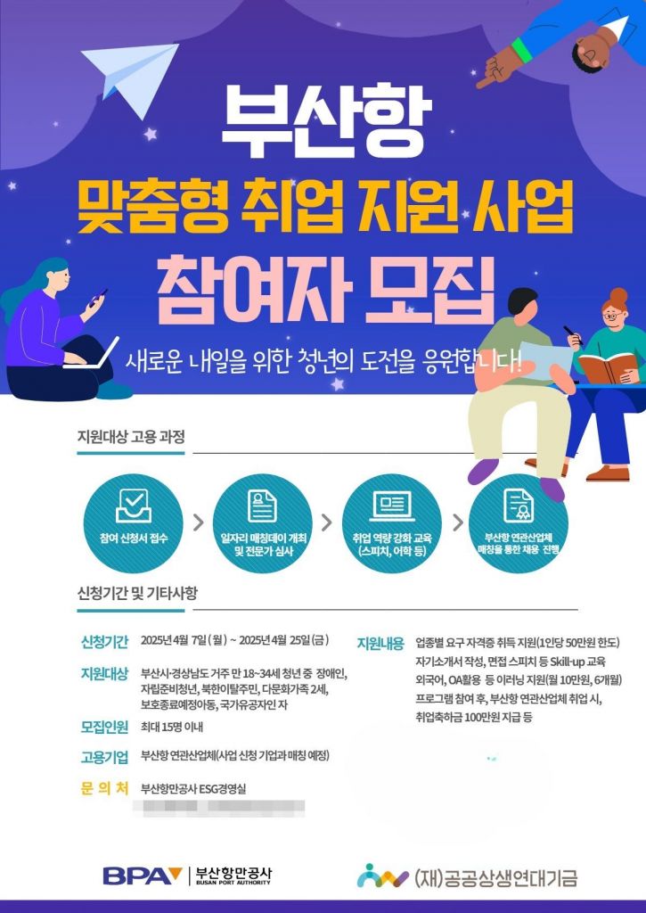 부산항만공사(BPA)는 공공상생연대기금(이사장 노광표)과의 업무협약을 통해 진행되는 '부산항 맞춤형 취업 지원 사업'의 청년 참여자를 모집한다.