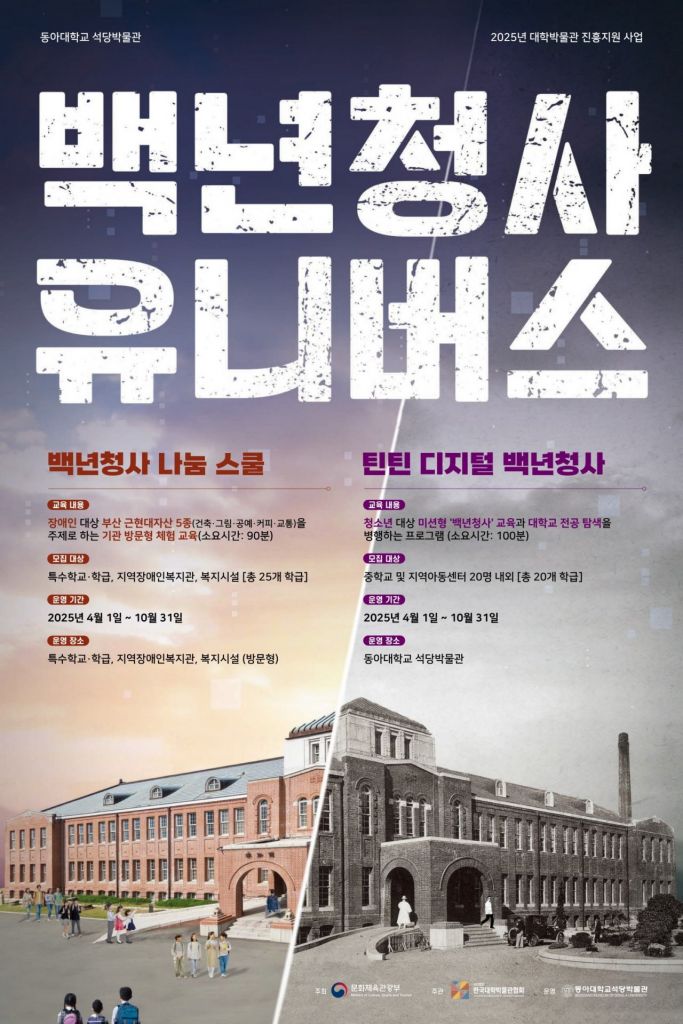 ‘백년청사 유니버스’는 대학 구성원과 지역 주민이 포용적이고 개방적으로 즐길 수 있는 대학박물관 교육 올인원(All-in-one) 플랫폼을 의미한다. 동아대 석당박물관은 이를 통해 ‘백년청사 나눔 스쿨’과 ‘틴틴 디지털 백년청사’ 두 가지 프로그램을 운영할 예정이다.