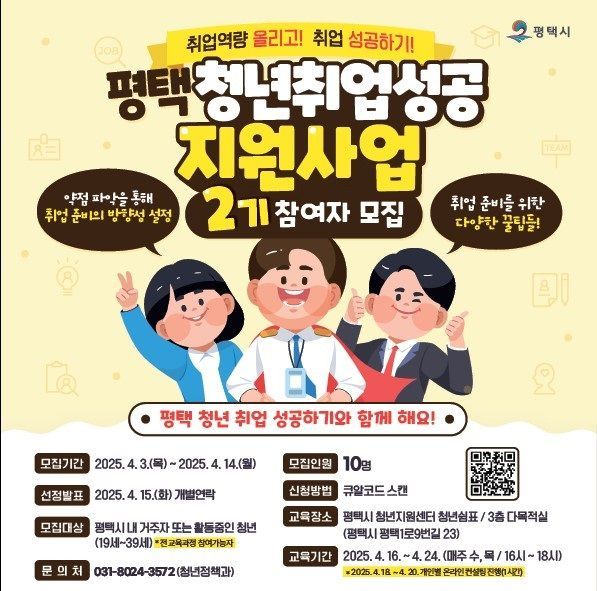 모집 인원은 10명으로, 평택시에 거주하거나 활동하는 19~39세 구직 청년이면 신청할 수 있다. 모집 포스터의 QR코드에 접속해 신청서를 제출하면 된다. 선정 결과는 15일 개별 통보한다.
