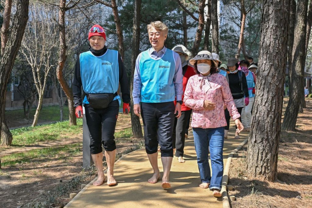 김이강 광주 서구청장이 2일 미세먼지 저감 및 정원문화 활성화를 위한 도시 숲 조성사업 대상지인 서구 무진푸른공원에서 서구민들과 맨발로를 걷는 등 현장 점검을 하고 있다. 광주 서구 제공