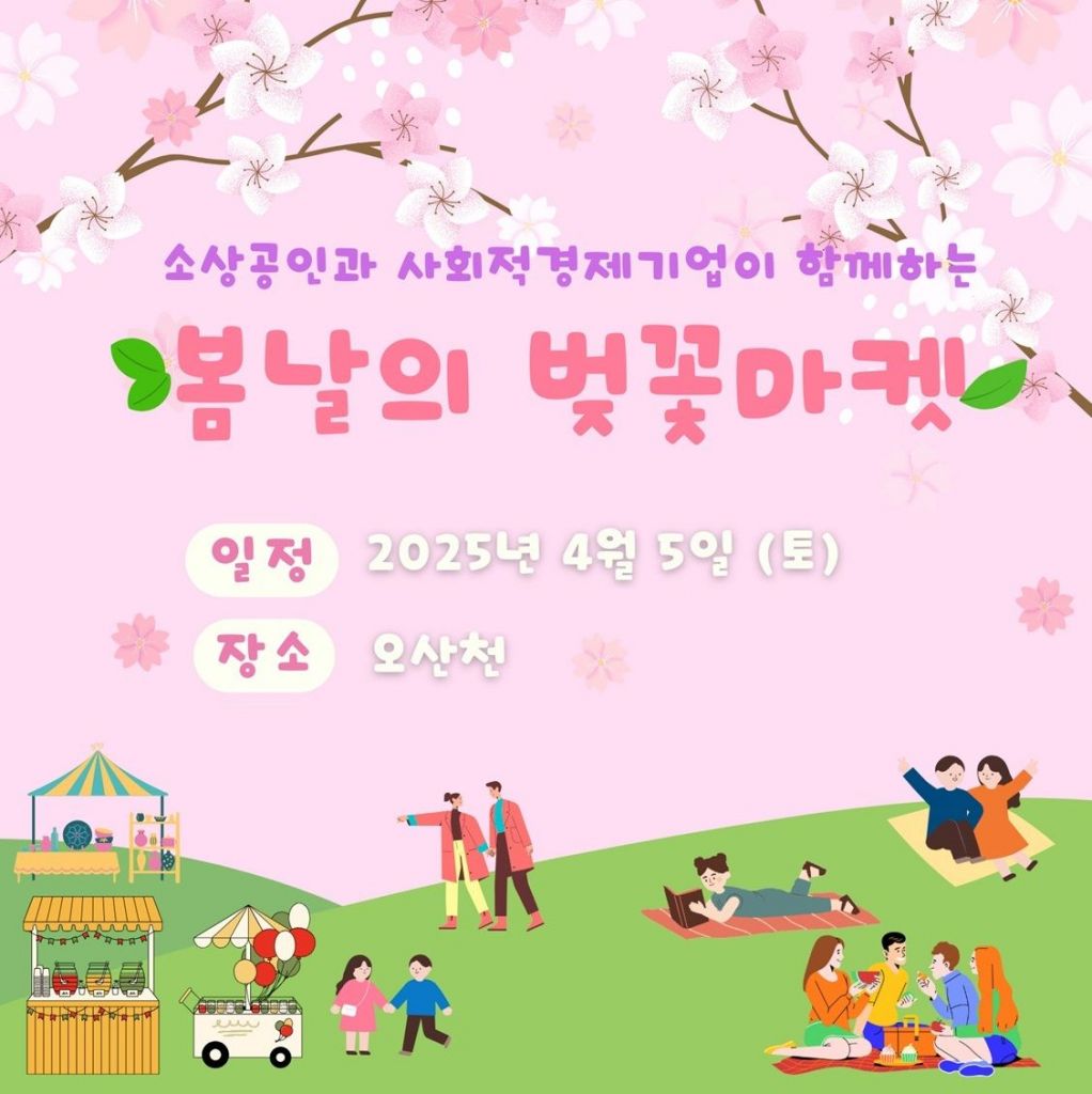 오산시소상공인연합회가 주최·주관하는 이번 마켓에는 관내 소상공인과 사회적경제기업 30여 팀이 참여해 수공예품, 커피, 디저트, 과일 등 다양한 제품을 선보일 예정이다. 시는 방문객들이 자연스럽게 지역 상생 소비에도 동참할 수 있도록 행사장을 구성했다. 시는 전국적인 산불 재난을 고려해 행사를 다소 축소하되, 행사장 한 편에 피크닉 존과 벚꽃 포토존을 마련해 운영할 예정이다.