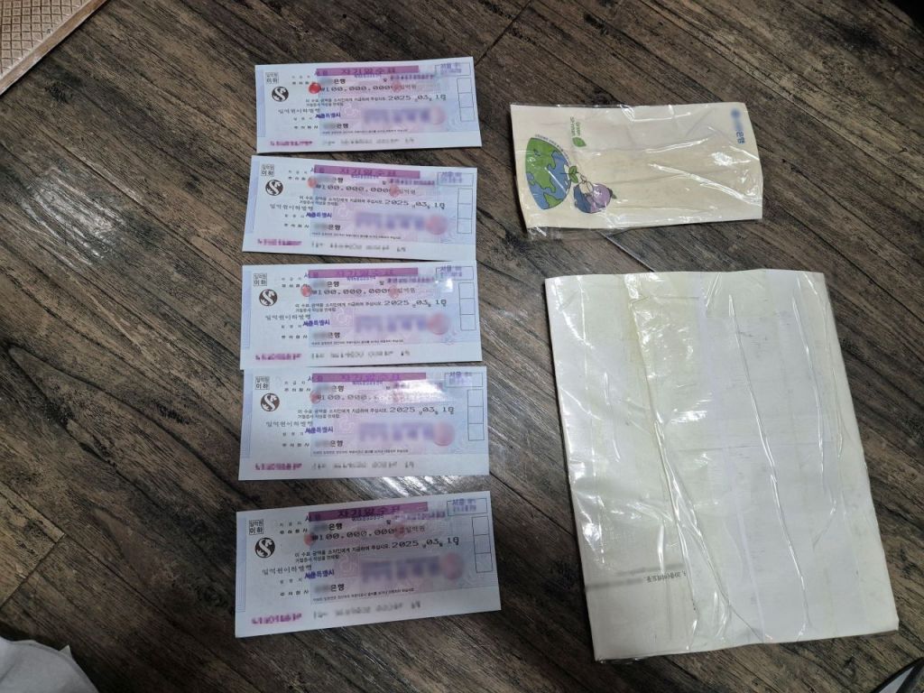경찰이 보이스피싱 현금수거책으로부터 압수한 수표. 경남경찰청 제공