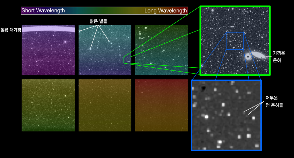왼쪽 첫 번째 이미지 상단의 밝은 선은 지구 대기 헬륨에 의한 것이다. 오른쪽 두 상자는 원본을 확대한 이미지이다. 초록색 상자에서 가까운 은하가 자세히 포착된 것을 볼 수 있고, 더 확대한 파란색 상자에서는 스피어엑스가 어둡고 먼 은하들도 관측할 수 있음을 확인할 수 있다.