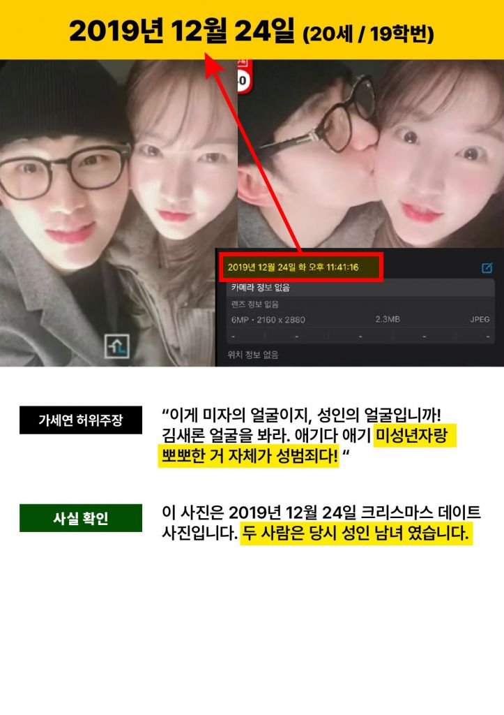 그러면서 법률대리인 측은 김수현이 故 김새론 배우와 미성년자 시절부터 교제했다는 주장은 사실이 아니라고 재차 부인했다. 법률대리인 측은 김수현이 고인과 함께 찍은 사진, 나눈 카카오톡 대화에 대해, 촬영 시점이 맞지 않거나 가족과 함께였다고 반박하는 설명 자료를 첨부했다.