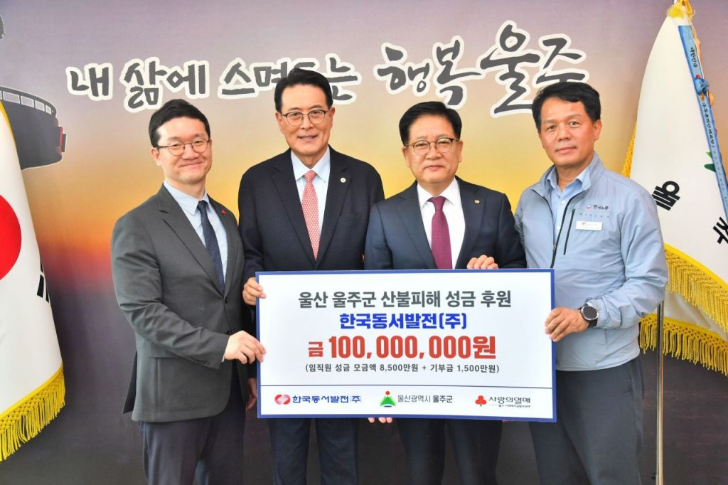 한국동서발전 임원진이 울주군 산불 피해 성금 1억원을 전달하고 있다. 울주군 제공