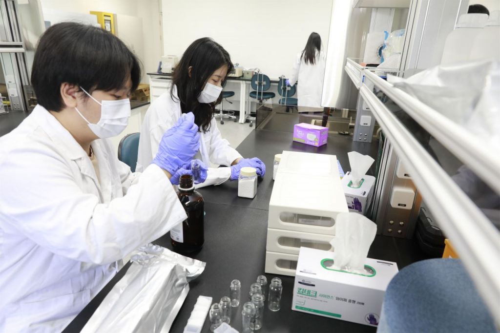 가천대학교 연구팀이 배터리특화실습실 고성능 셀 개발을 위한 전극 슬러리 제조실습을 하고 있다. 가천대학교 제공