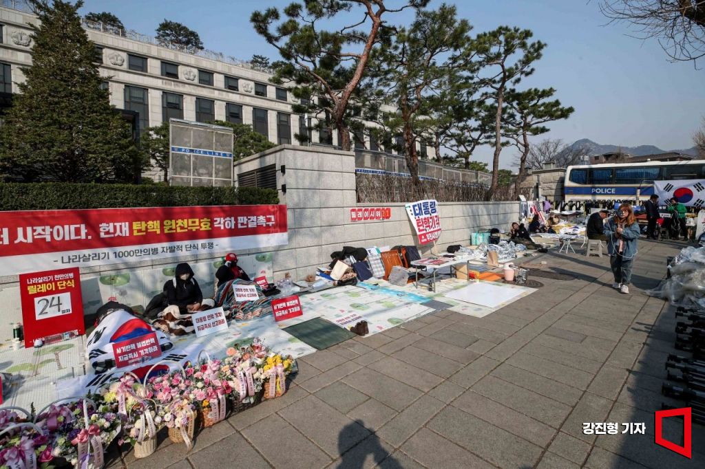 윤석열 대통령 탄핵 사건에 대한 선고가 이틀 앞으로 다가온 2일 서울 종로구 헌법재판소 앞에서 탄핵 반대를 촉구하는 세력이 피켓시위를 이어가고 있다. 2025.4.2. 강진형 기자