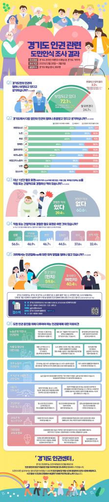 경기도는 지난 2월28일부터 3월9일까지 도민 6380명을 대상으로 ‘경기도 인권 관련 도민인식 조사’ 온라인 여론조사를 실시한 결과 응답자의 72.1%는 경기도민으로서 인권이 보장되고 있다고 답했다. 보장되고 있지 않다는 응답은 3.2%에 그쳤다.