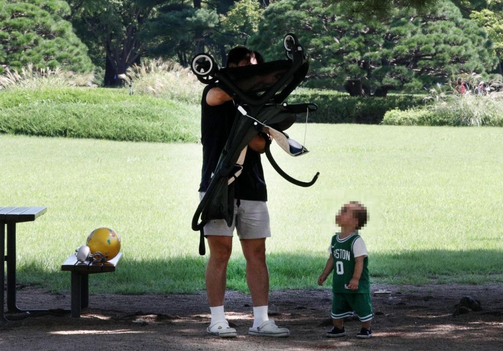 유모차를 번쩍 들어 흙먼지를 털어내는 아빠의 모습. 기사 내용과 무관한 아시아경제 DB