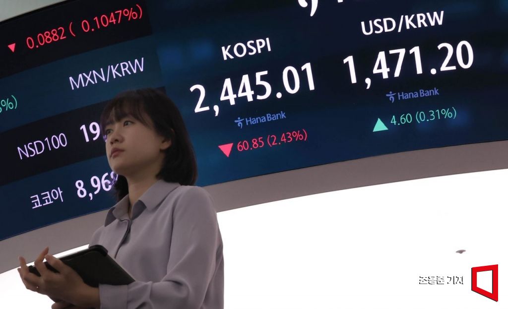 도널드 트럼프 미 행정부가 한국에 25%의 상호관세 세율을 적용한 3일 서울 중구 하나은행 본점 딜링룸에서 딜러가 업무를 보고 있다. 이날 코스피는 전날보다 68.43p(2.73%) 내린 2,437.43으로, 원/달러 환율은 4.4원 오른 1,471.0원, 코스닥은 14.10p(2.06%) 내린 670.75로 시작했다. 2025.4.3 조용준 기자