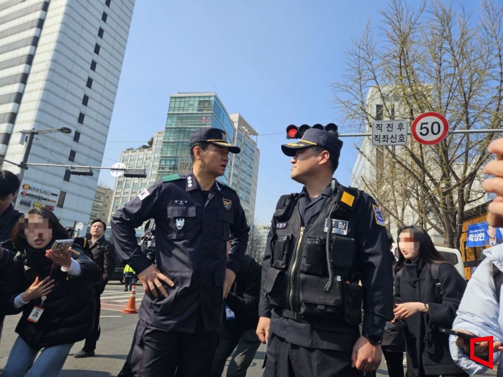 박현수 서울경철청장 직무대리(왼쪽)가 3일 오전 서울 종로구 헌법재판소 인근에서 주변 경비 태세를 점검하고 있다. 박승욱 기자