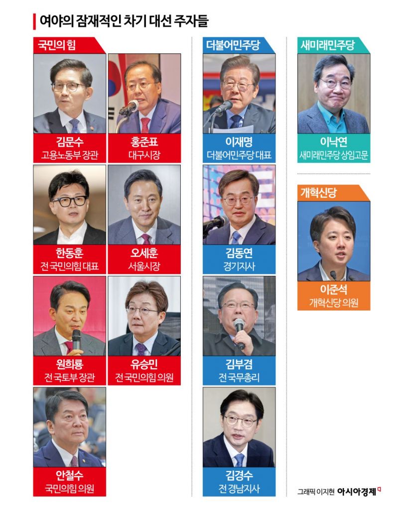 이외에도 전재수 의원, 김두관 전 의원 등이 경선 도전 가능성이 거론된다. 새미래민주당 상임고문을 맡은 이낙연 전 총리는 최근 ‘합리적 중도 세력’을 강조하며 목소리를 확대하고 있고, 조기 대선에 가장 먼저 출사표를 던진 이준석 개혁신당 의원은 선거체제에 돌입하며 대국민 소통 강화에 나섰다.