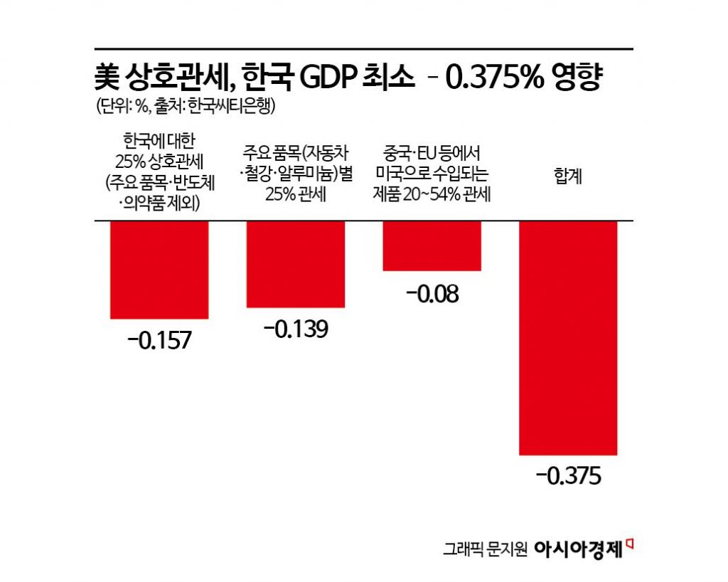 이번 상호관세 조치는 올해 한국의 GDP 성장률 전망치에도 영향을 끼칠 것으로 보인다. 씨티는 최근 한국 GDP 성장률 전망치 1.2%에서 1.0%로 하향 조정했다. 김 이코노미스트는 상호관세 조치가 해당 전망치에 하방리스크로 작용한다고 바라봤다.
