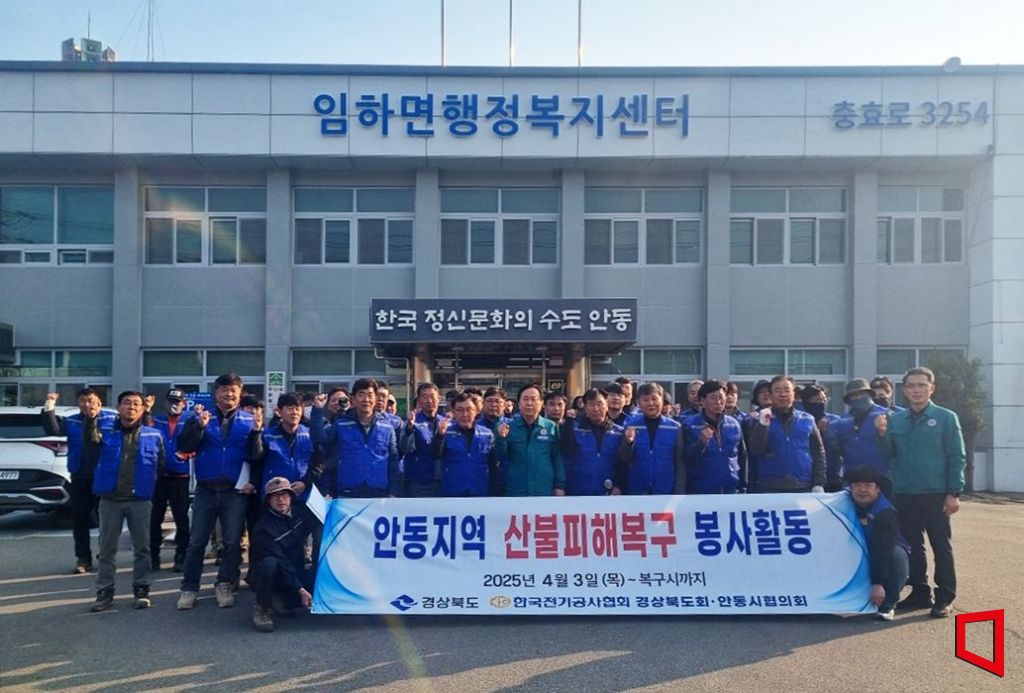 3일 안동시가 산불피해지역 전기시설 긴급 복구 시행 전 기념촬영 하고 있다.