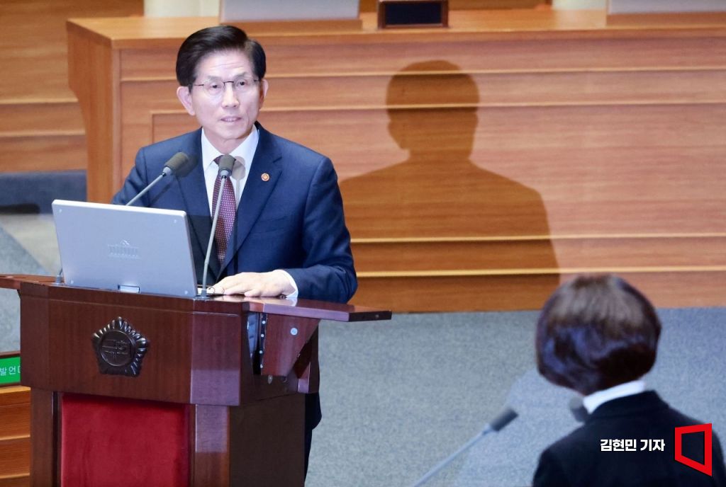 김문수 고용노동부 장관이 3일 국회 본회의에서 열린 '경북·경남·울산지역 산불 사태 수습과 피해대책 마련 및 헌법질서 수호를 위한 긴급현안질문'에서 한정애 더불어민주당 의원의 질의에 답하고 있다.