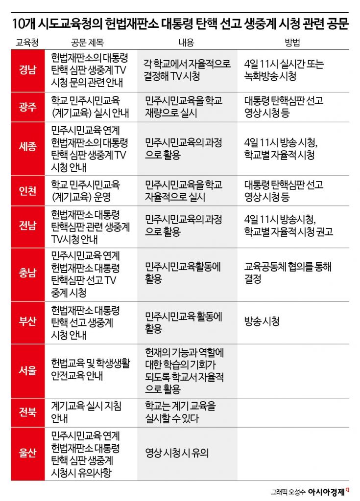 서울시교육청 관계자는 "탄핵 선고와 관련해 헌재의 기능과 역할 등은 학습 자료가 된다"면서도 "방송 시청 자체보다 팩트를 통한 계기교육이 더 중요해 공문에 '권고한다'는 내용은 넣지 않았다"고 했다.